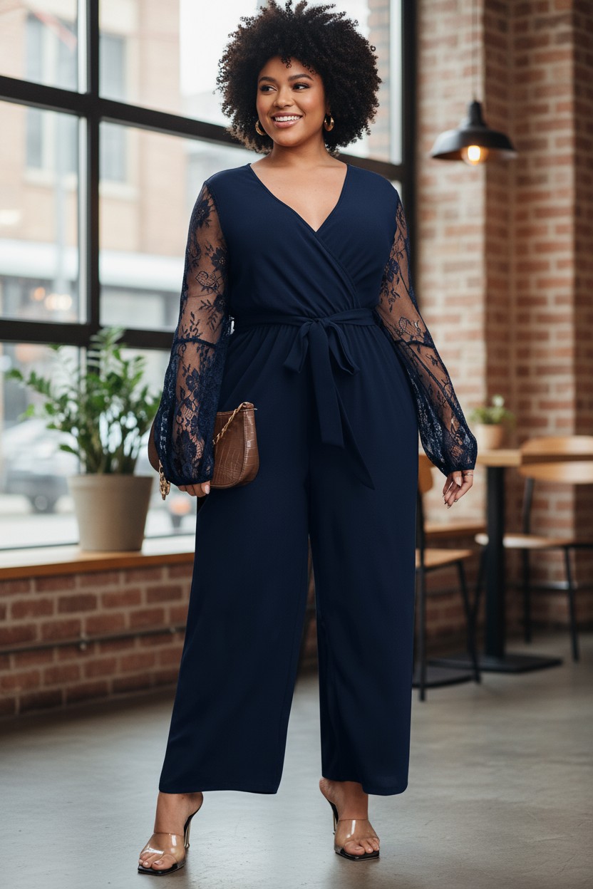 Monito largo azul oscuro de mangas largas en encaje fino, escote v, cintura elastizada, cinto movible en su propia tela. – Colección Chic