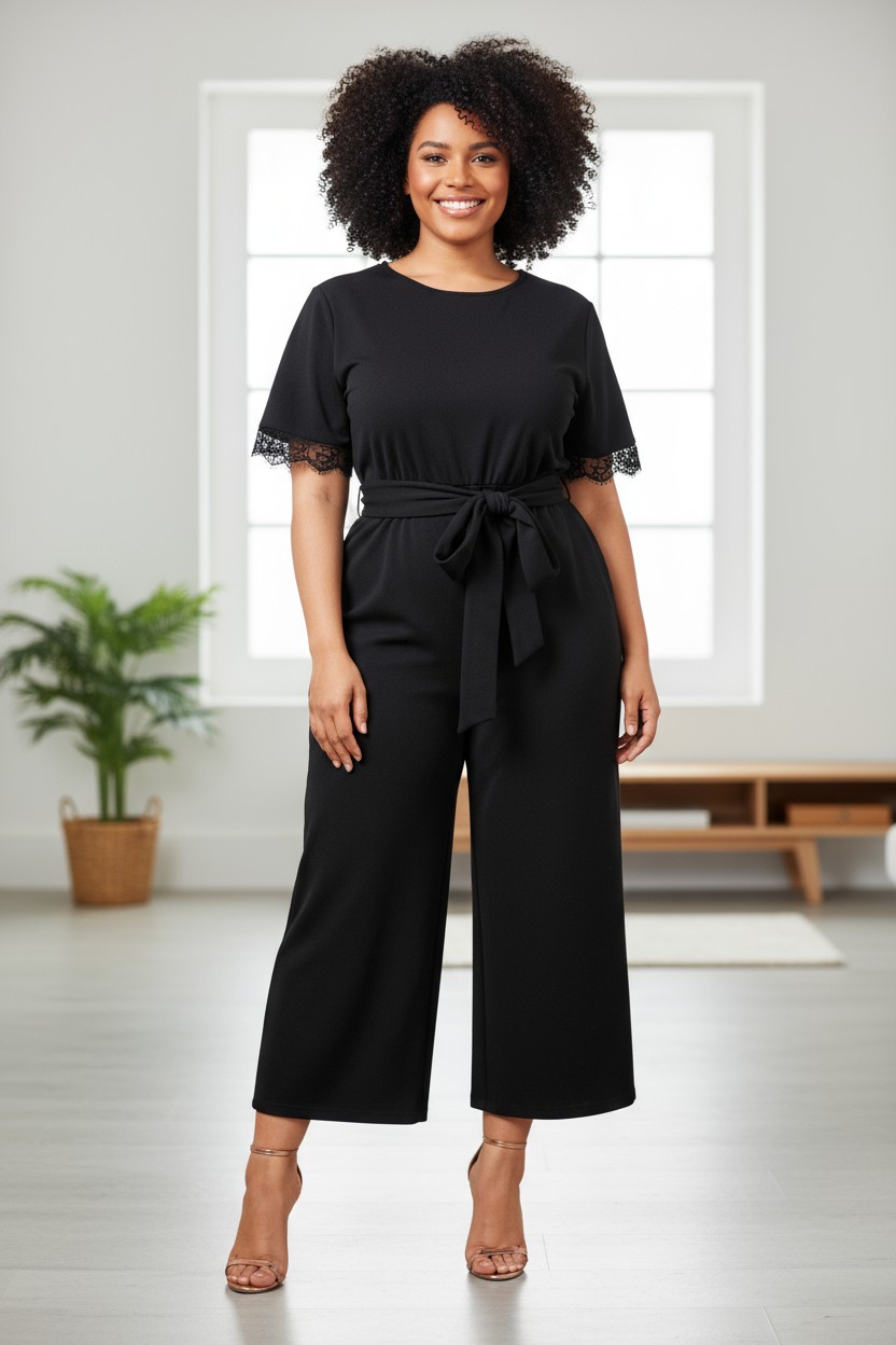 Monito largo negro de mangas, con los bordes de mangas en encaje, con cinto en su propia tela, escote redondo, tela gruesita semi stretch. – Colección Chic