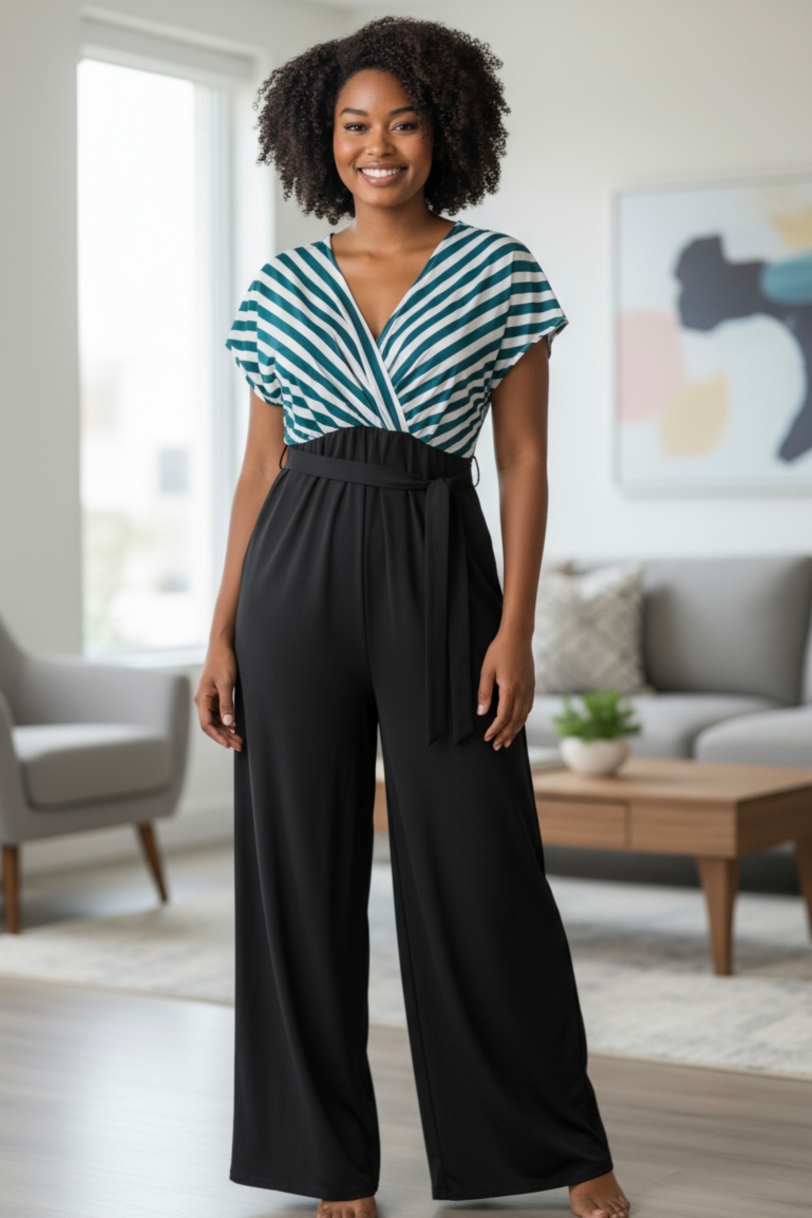 Monito largo negro con parte superior en rayas blacas y verdes, escote v y mangas tipo murcielago, cintura elastizada, cinto. – Colección Chic