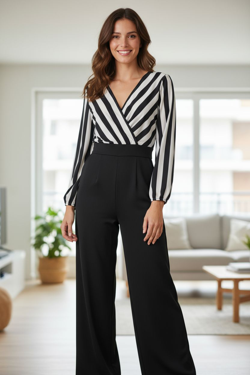 Monito largo negro escote v, con parte superior en rayas blancas y negras, mangas largas con elastico en puño. – Colección Chic