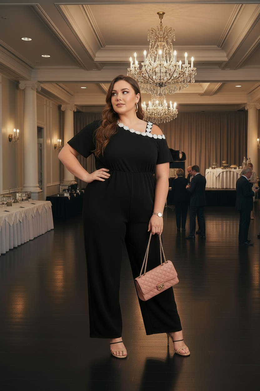 Mono largo negro con asimétrico de un hombro, aplicaciones de flores blancas, tela gruesa stretch y cintura elastizada.