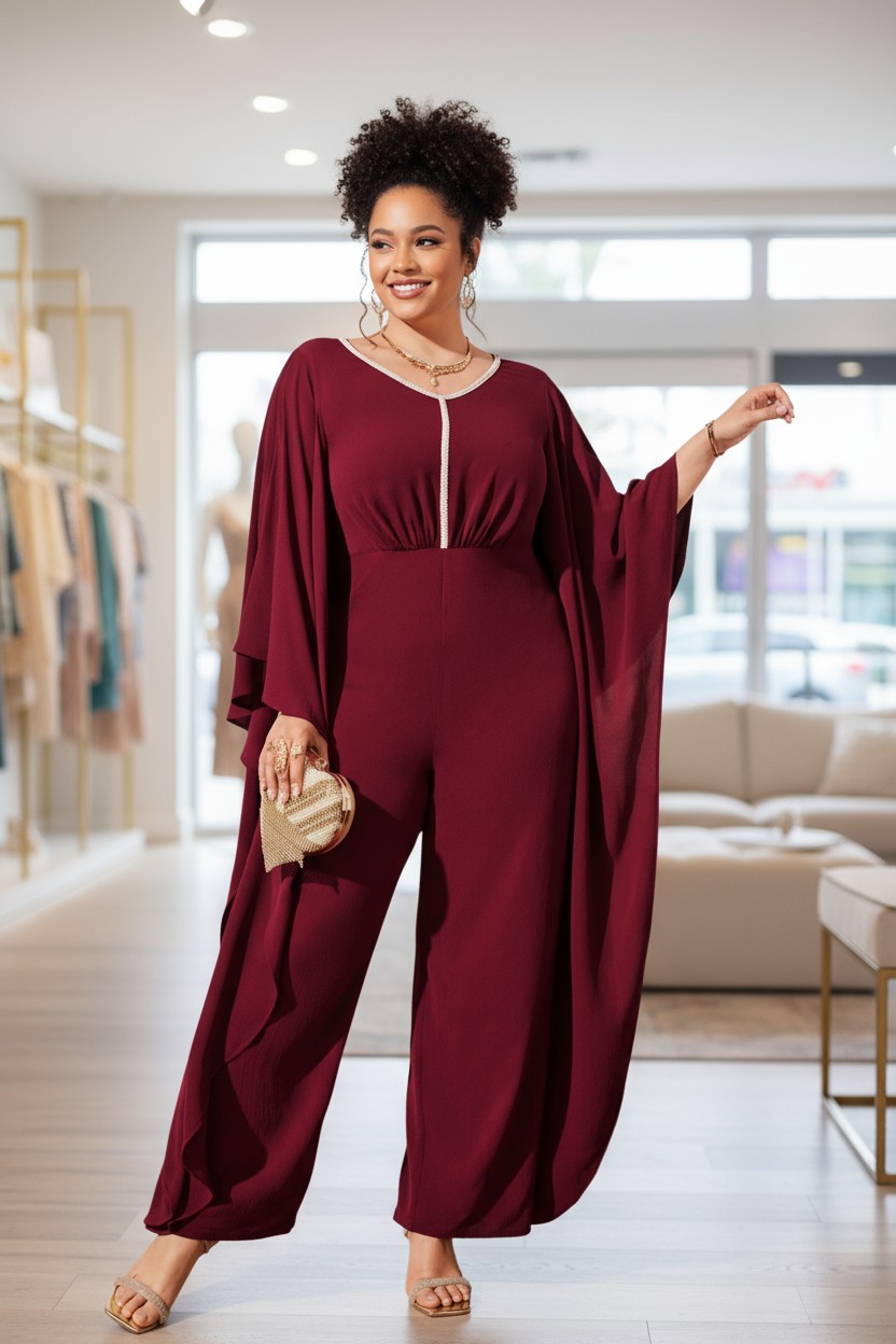 Monito largo bordó con mangas tipo murcielago desde brazos hasta los pies, escote v, con aplique fino de galon con perlas en cuello y busto. – Colección Chic