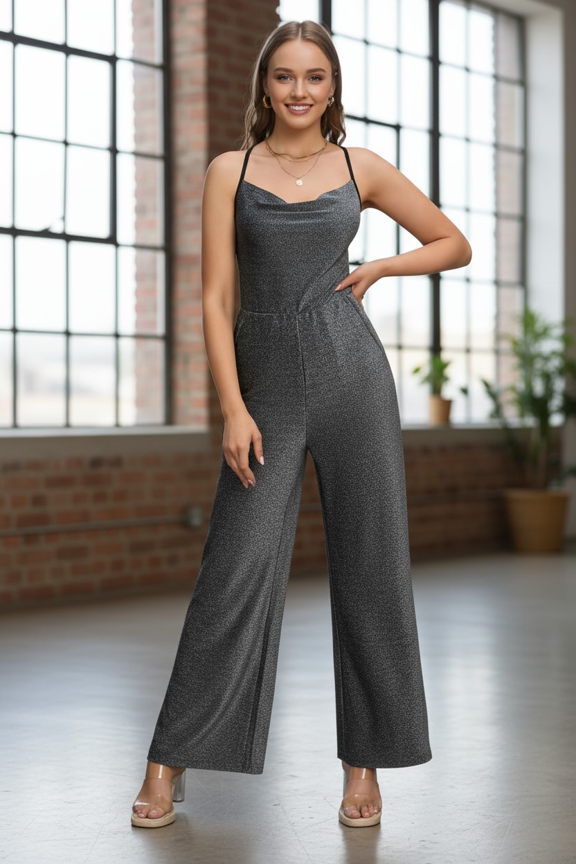 Monito largo negro lurex plata con bretel fino regulable, escote buche, con cintura elastizada, con bolsillos laterales. – Colección Chic