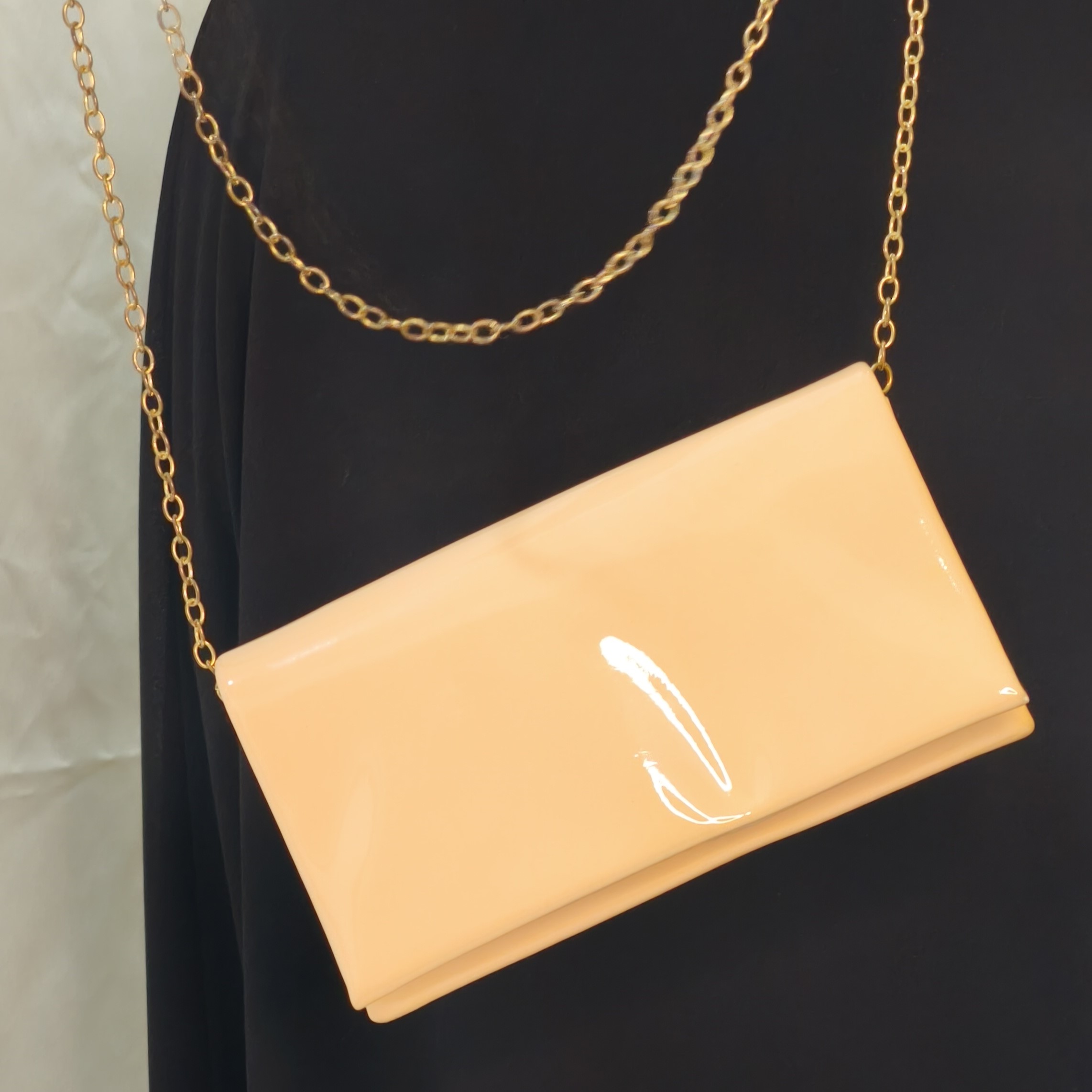 Sobre chico nude en charol, broche de botón imantado y correa larga de cadena
