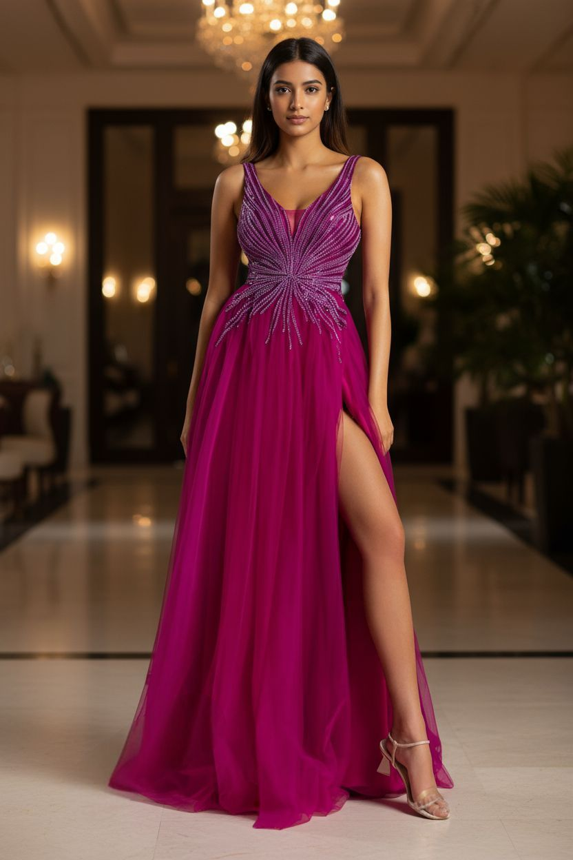 Vestido largo uva de tul, con parte superior armada, con escote profundo traslúscido, bretel ancho, parte superior bordada en canutillos y lentejuelas, tajo en lado izquierdo, espalda atada con cintas y cierre. – Colección Royal