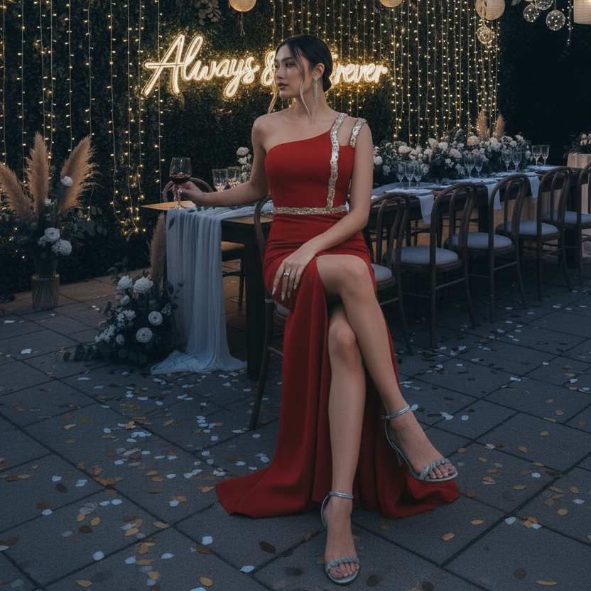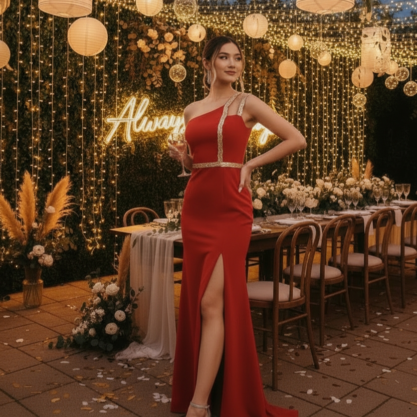Vestido largo naranja terracota corte sirena, diseño asimétrico de un hombro con doble bretel hacia la espalda, galón bordado en lentejuelas doradas alrededor de la cintura y breteles, busto armado y tajo izquierdo. – Colección Chic