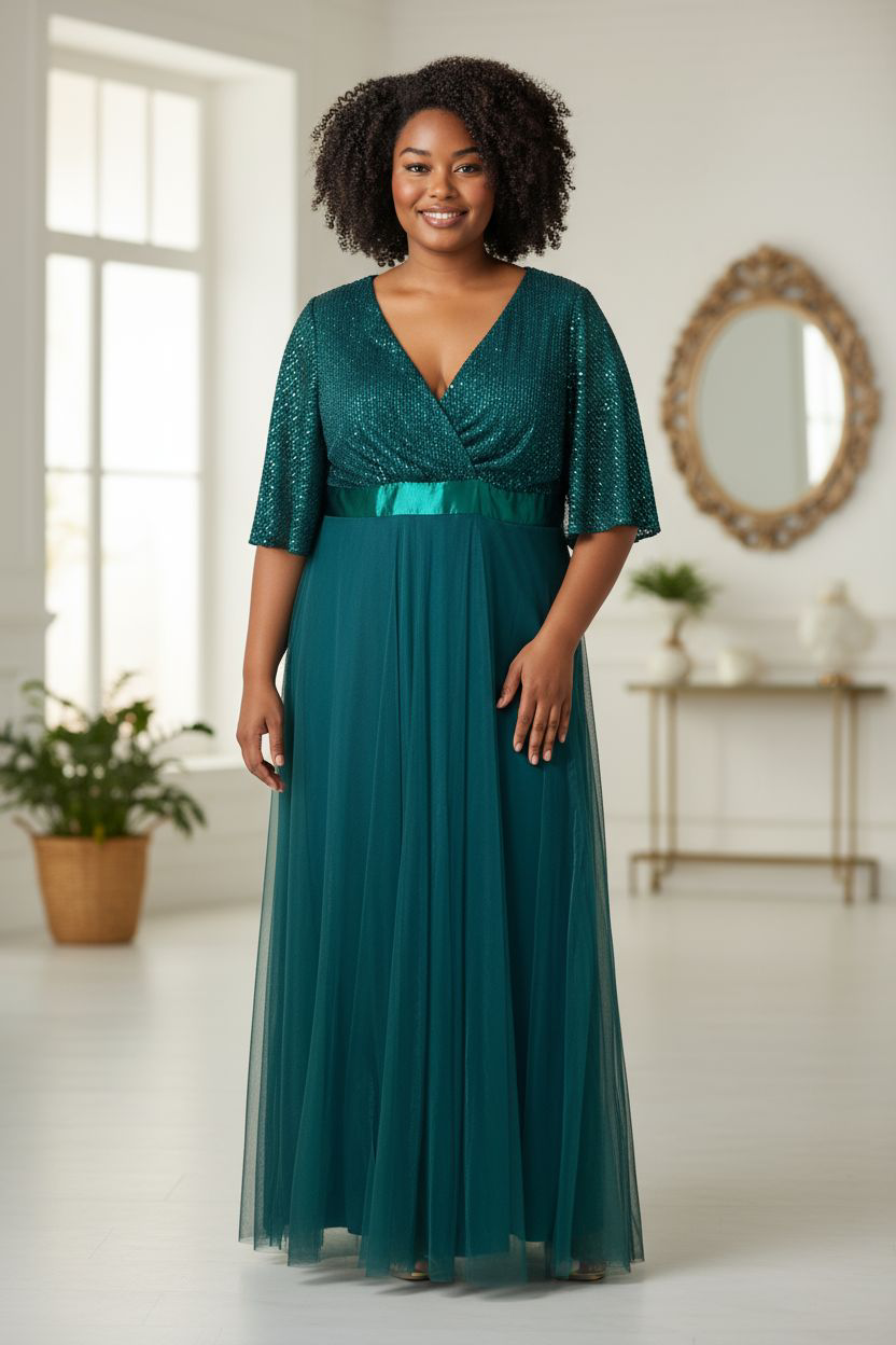 Vestido largo verde con mangas mariposa, parte superior en lentejuelas en su propio color, cinto fijo elastizado verde, escote v cruzado, falda en tul. – Colección Chic