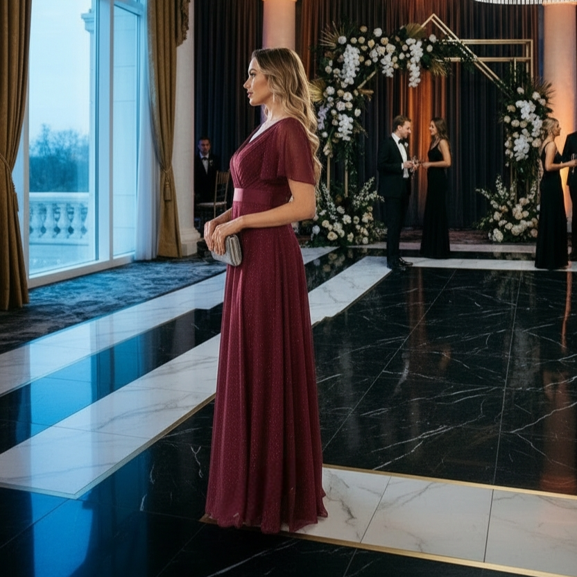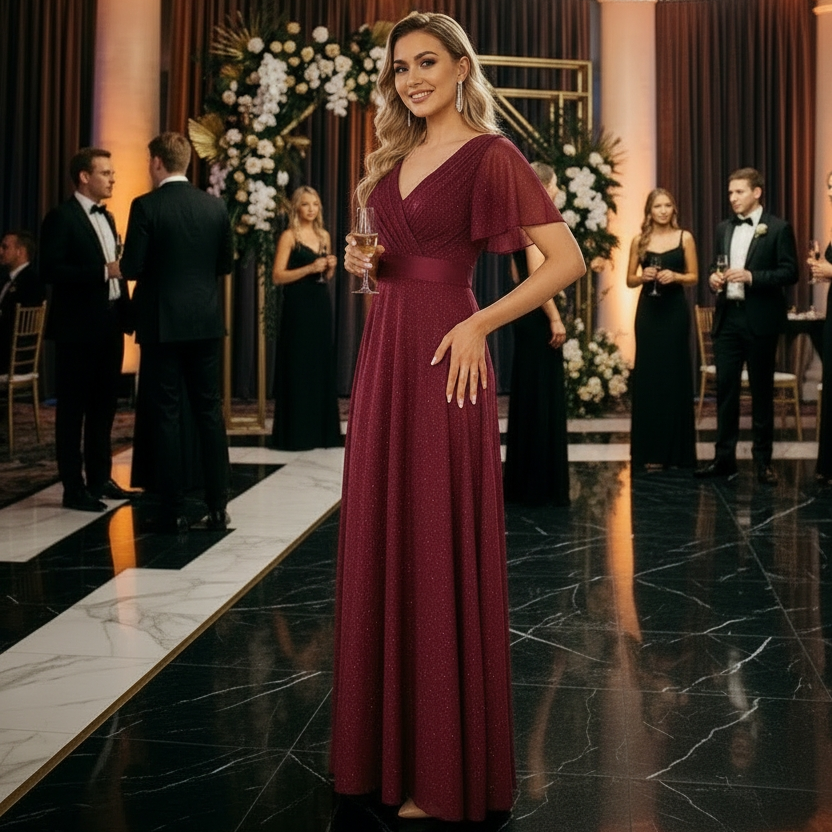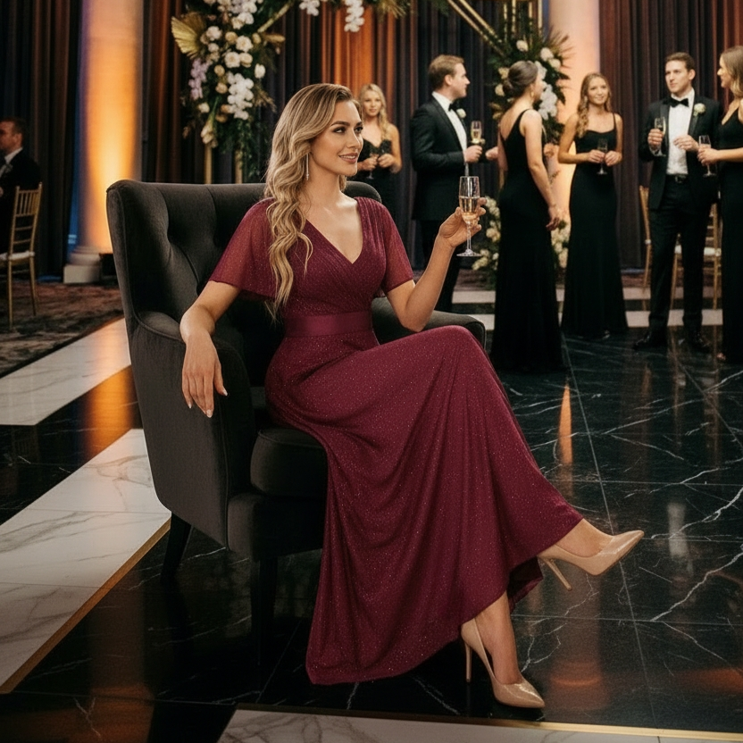 Vestido largo bordó con destellos plata en toda la tela, mangas mariposa, busto plisado, escote en V cruzado delantero y trasero y galón elastizado en cintura. – Colección Chic
