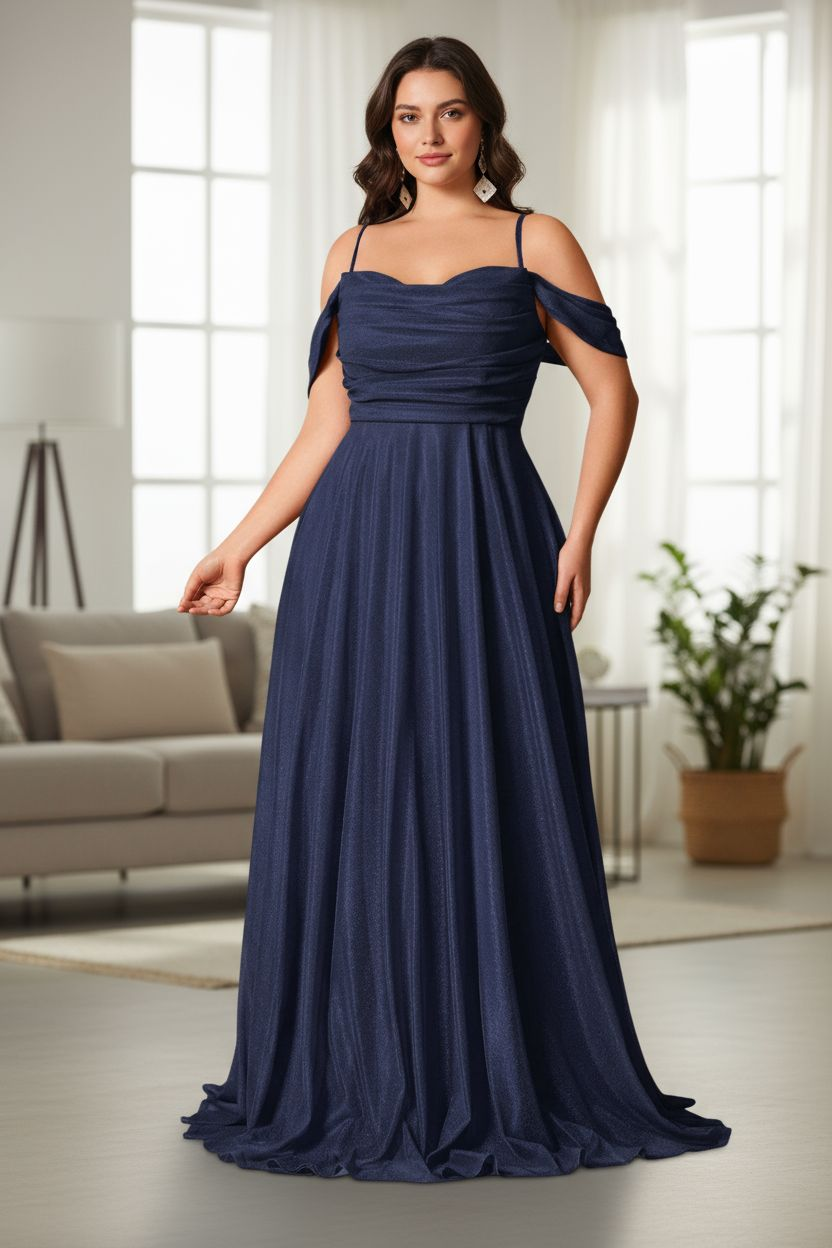 Vestido largo azul oscuro con destellos plateados, bretel fino que se cruza y ata atras, manga caida, con sobre tela tipo buche en parte superior y escote en v, sin tajo. – Colección Chic