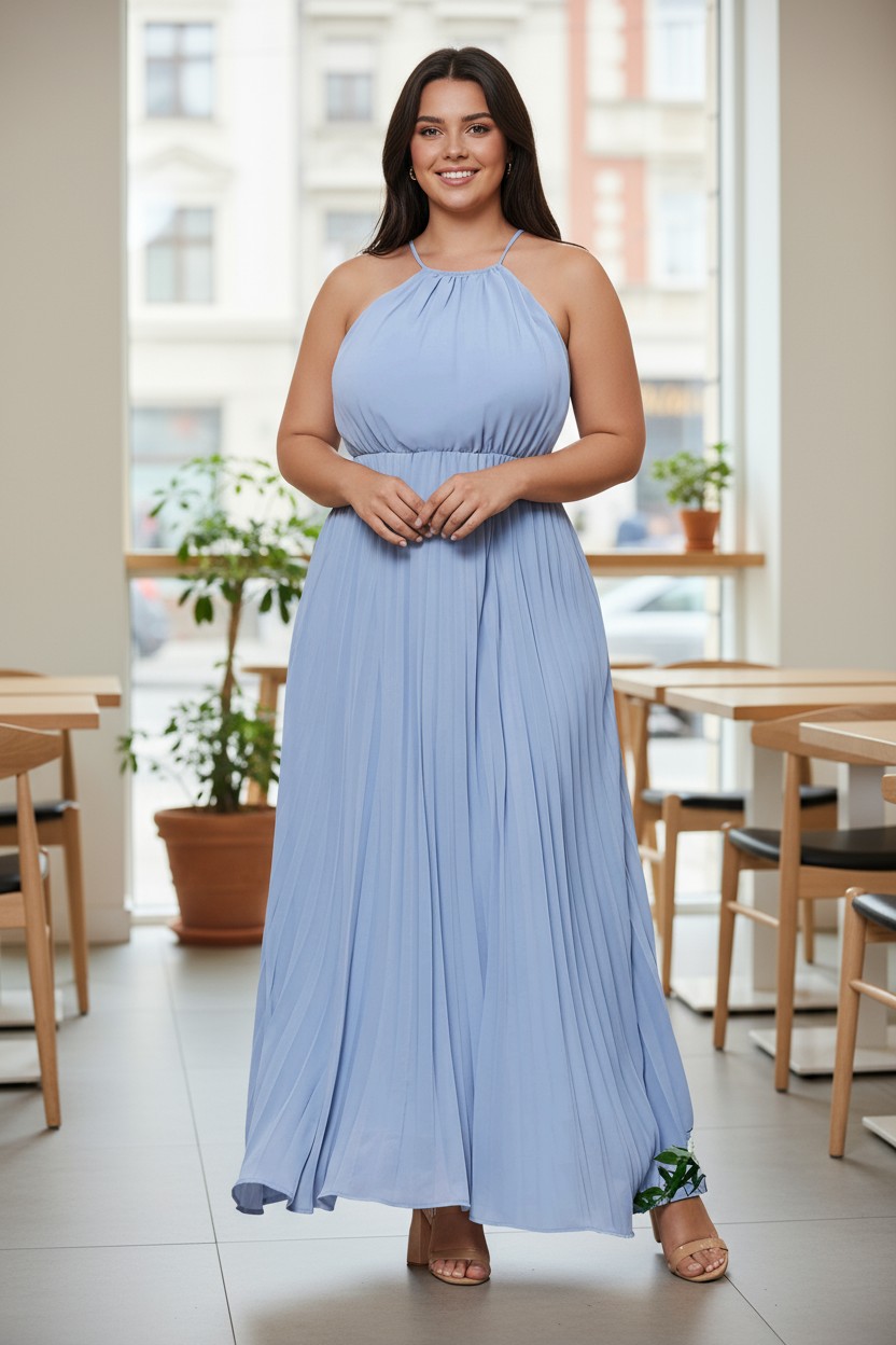 Vestido largo celeste con cuello healter atado y pollera plizada, sin tajo. – Colección Chic