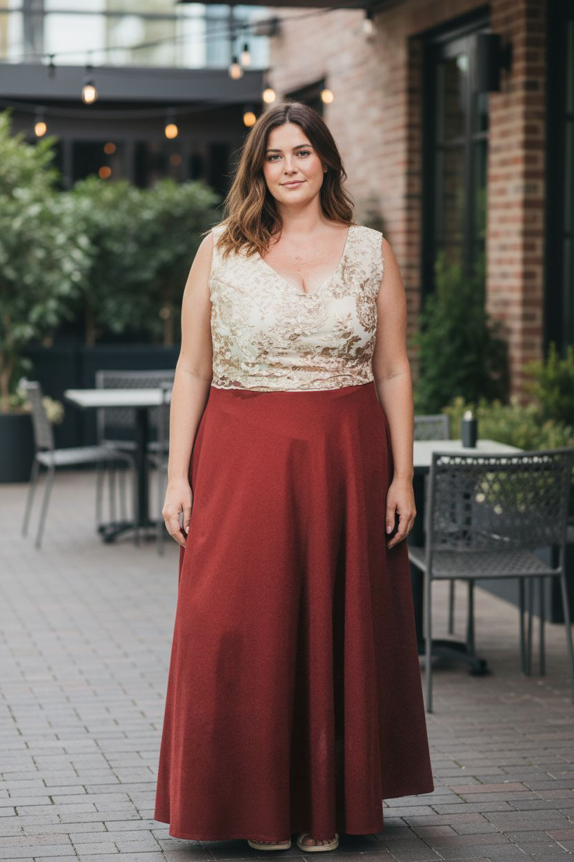 Vestido largo bordo de bretel ancho, escote v, parte superior de forro blanco con tul dorado bordado, cintura elastizada. – Colección Chic