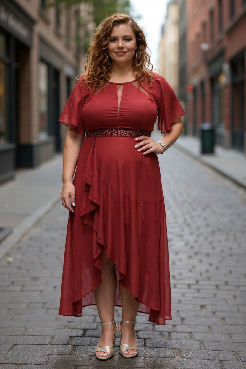 Vestido largo bordó con cuello a la base, partes con tul trasluscido en parte superior y mangas, busto armado, galon en cintura, pollera corta adelante que cae larga hacia atras, abertura con volados en bordes que sale desde galon. – Colección Chic