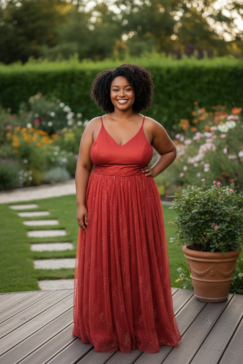 Vestido largo bordó de tul con lunares dorados, escote v, busto armado, breteles finos regulables, cinta fija en cintura. – Colección Chic