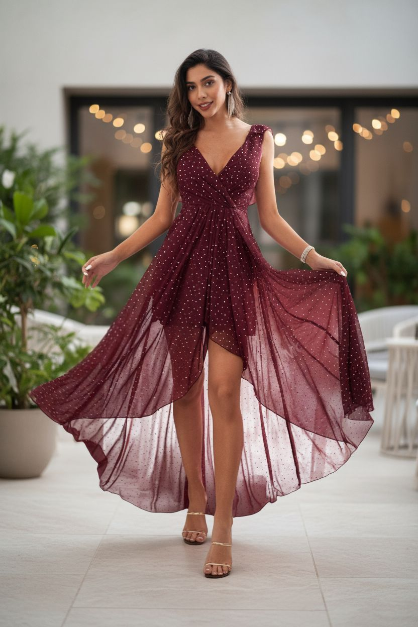 Modelo Laura – Vestido Bordó Falda Asimetrica