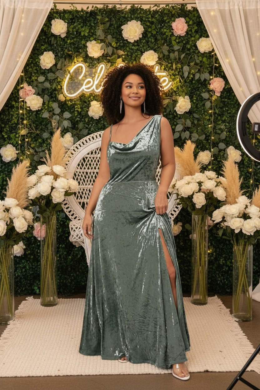 Vestido largo verde menta y gris de terciopelo con bretel fino regulable y bretel ancho, escote y espalda tipo buche y tajo lateral. – Colección Chic