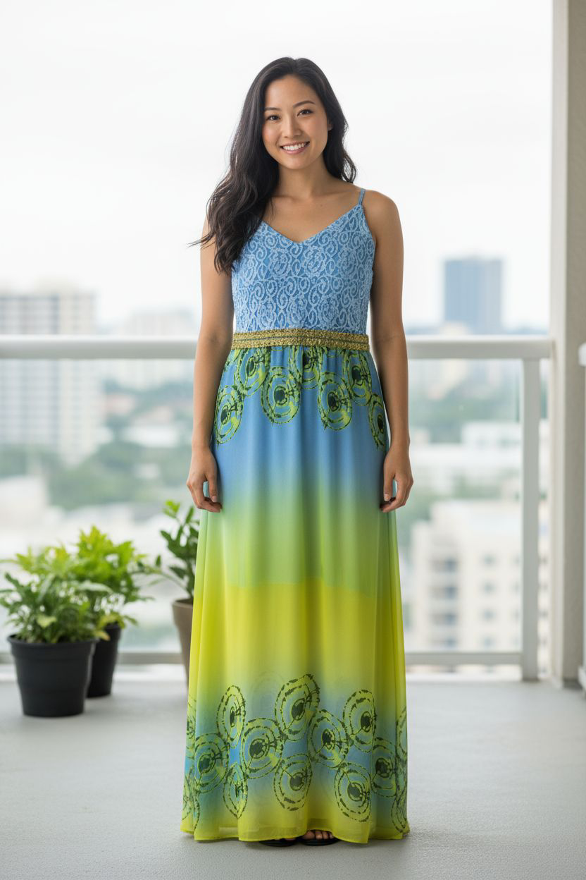 Vestido largo celeste con parte superior de encaje blanco, galon dorado en bretel fino y cintura, pollera estampada en colores celestes, gris y amarillos, pollera con forro corto. – Colección Chic