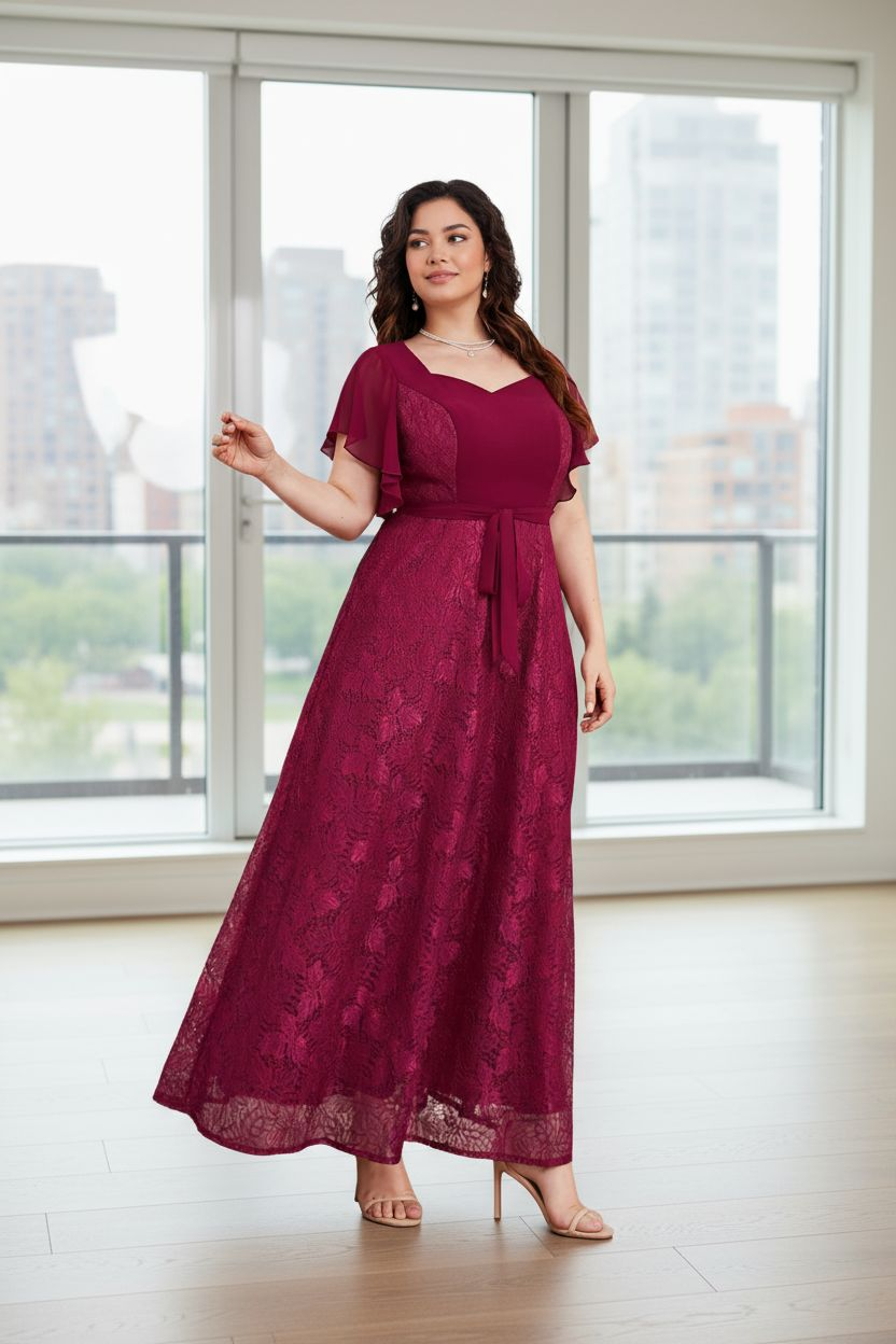 Vestido largo bordó de encaje con parte superior mitad en gasa y mitad en encaje, escote tipo cuadrado con v, mangas mariposa. – Colección Chic