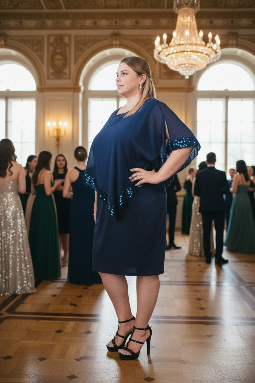 Vestido corto azul oscuro stretch con capa triangular de gasa y bordes en lentejuelas. – Colección Chic